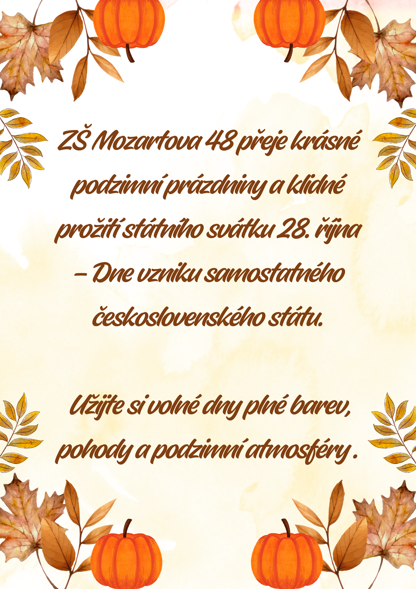 Užijte si zasloužený odpočinek a krásné podzimní dny. Ve škole se uvidíme ve čtvrtek 30. října a v pátek 31. října nezapomeňte na halloweenský kostým.