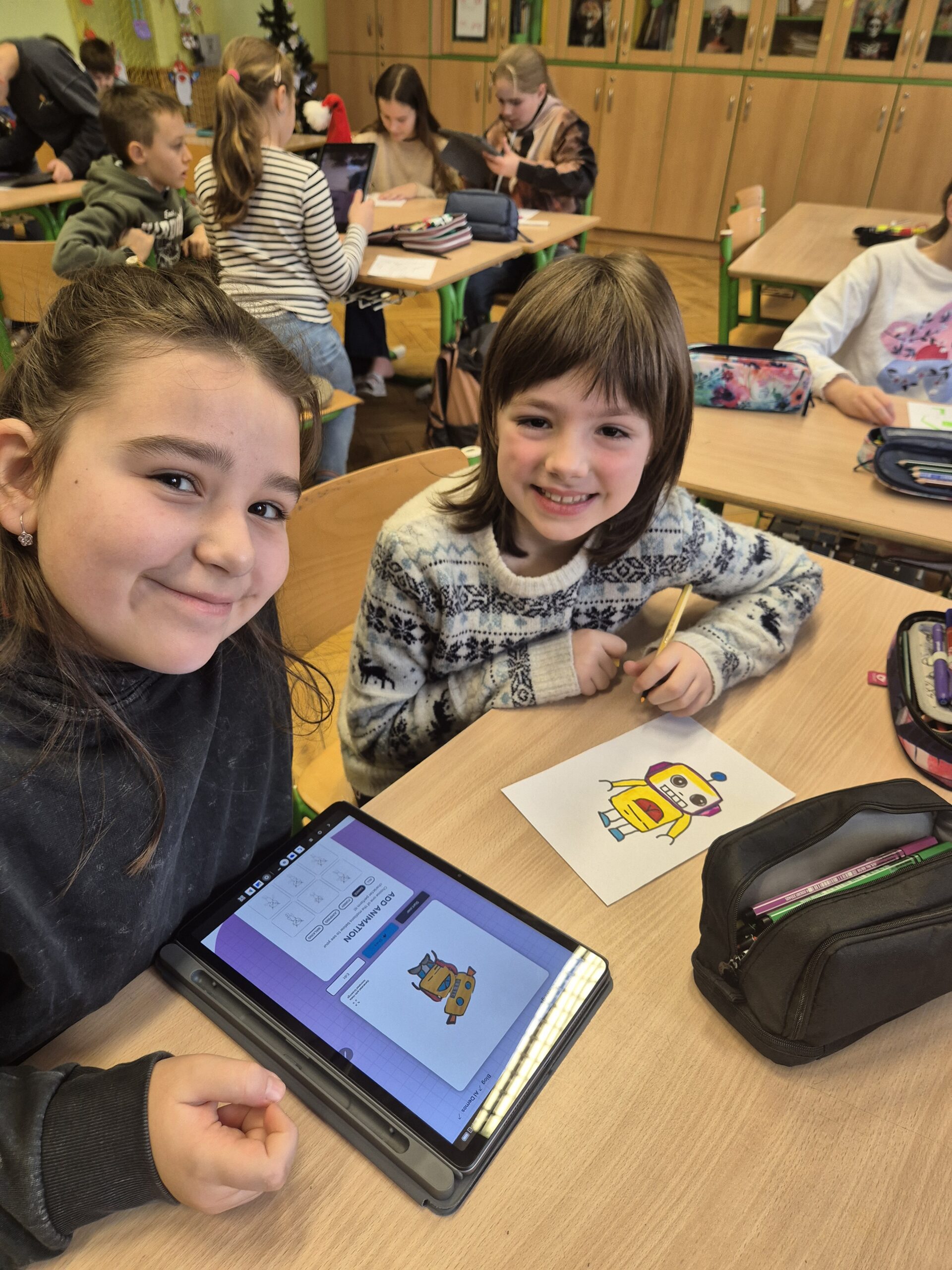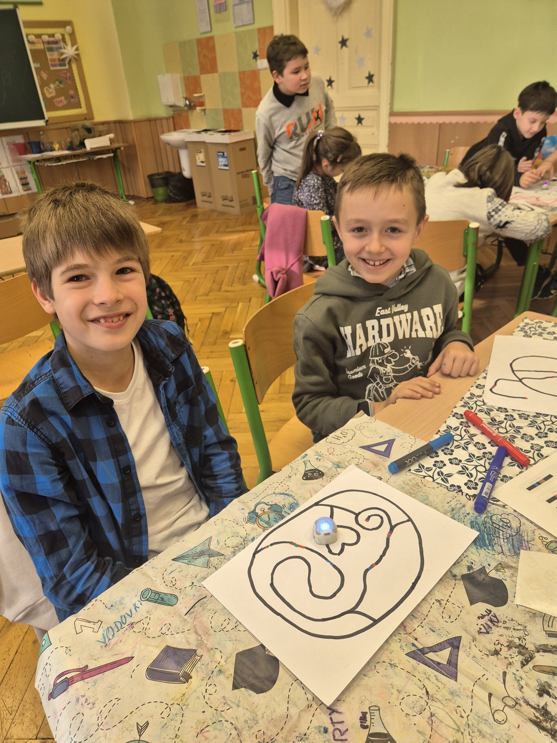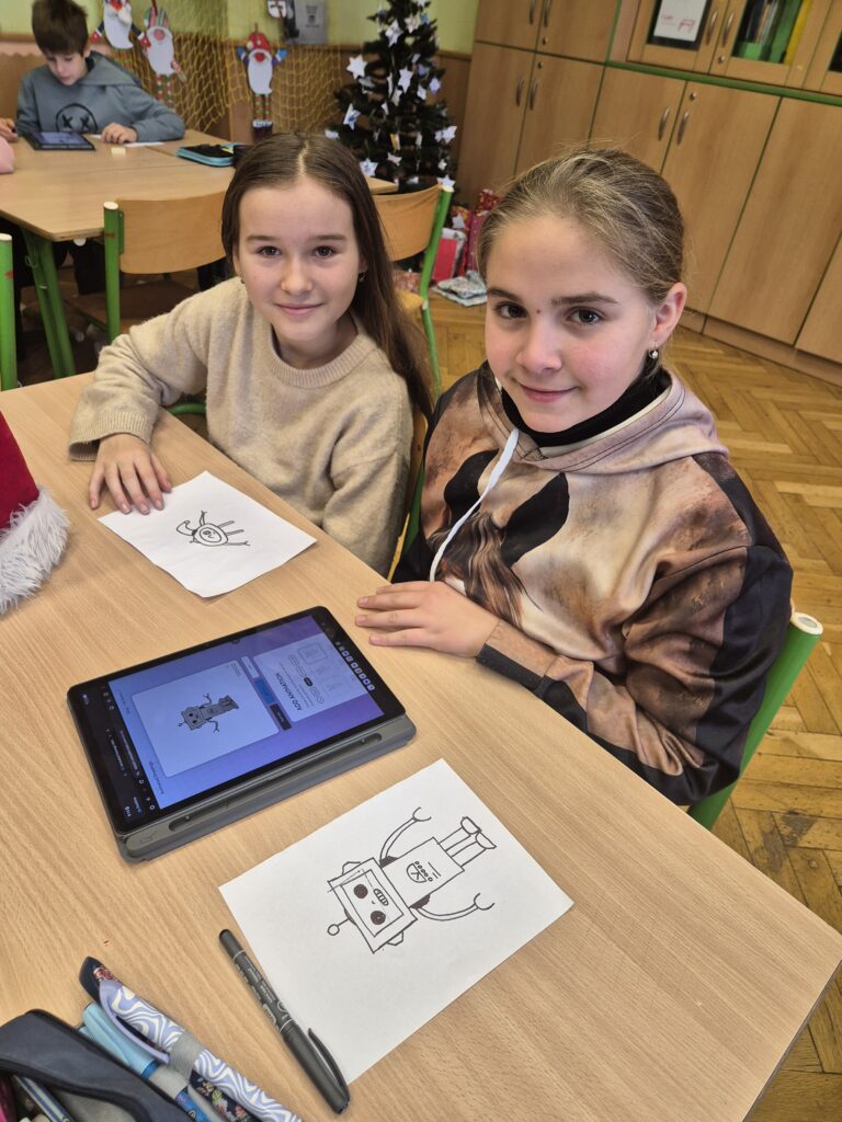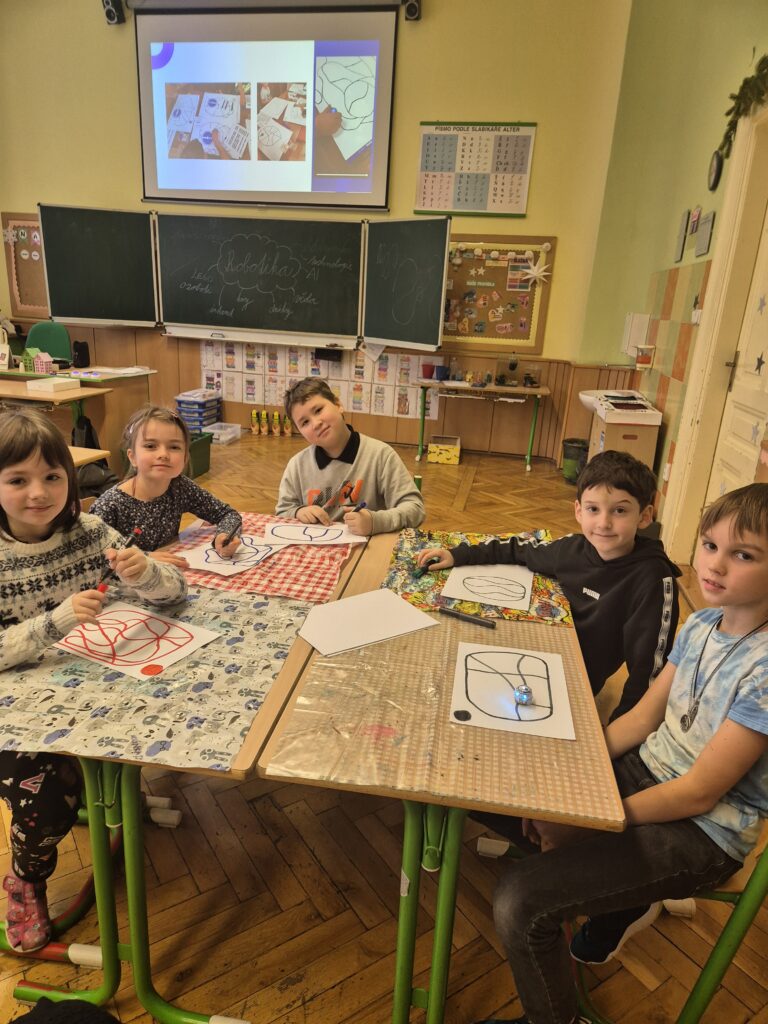 Na začátku jsme si pomocí aplikace Animated Drawings „oživili“ kreslené robůtky. Následně jsme si téma robotiky přiblížili pomocí myšlenkové mapy. Hlavní pomůckou se stali ozoboti, které jsme si nejprve představili a poté zkoumali, co všechno tito malí robůtci dokážou. Děti vytvářely rybníčky a cestičky, po kterých ozobot jezdil, a následně jej programovaly pomocí ozokódů. Díky nim robota přiměly jet pomalu, cik‑cak nebo dokonce udělat piruetu.