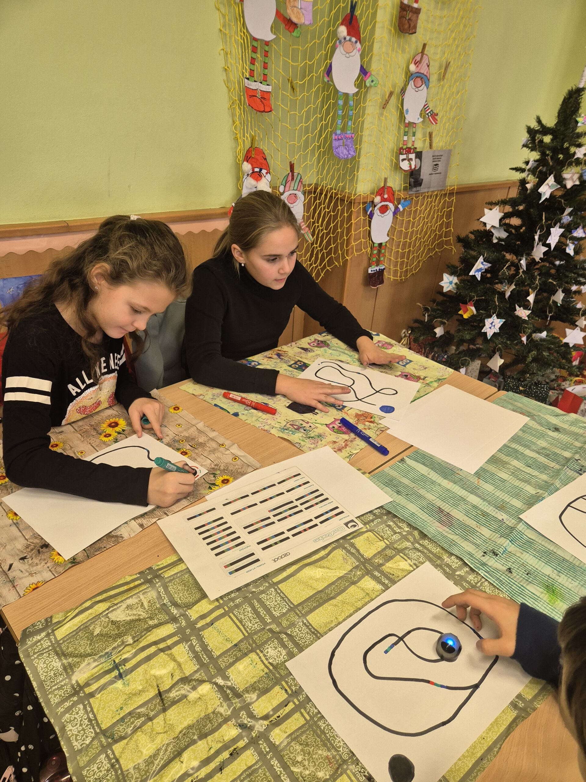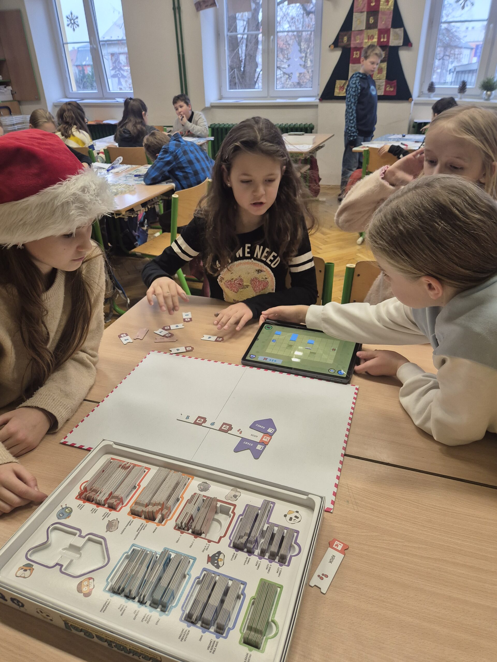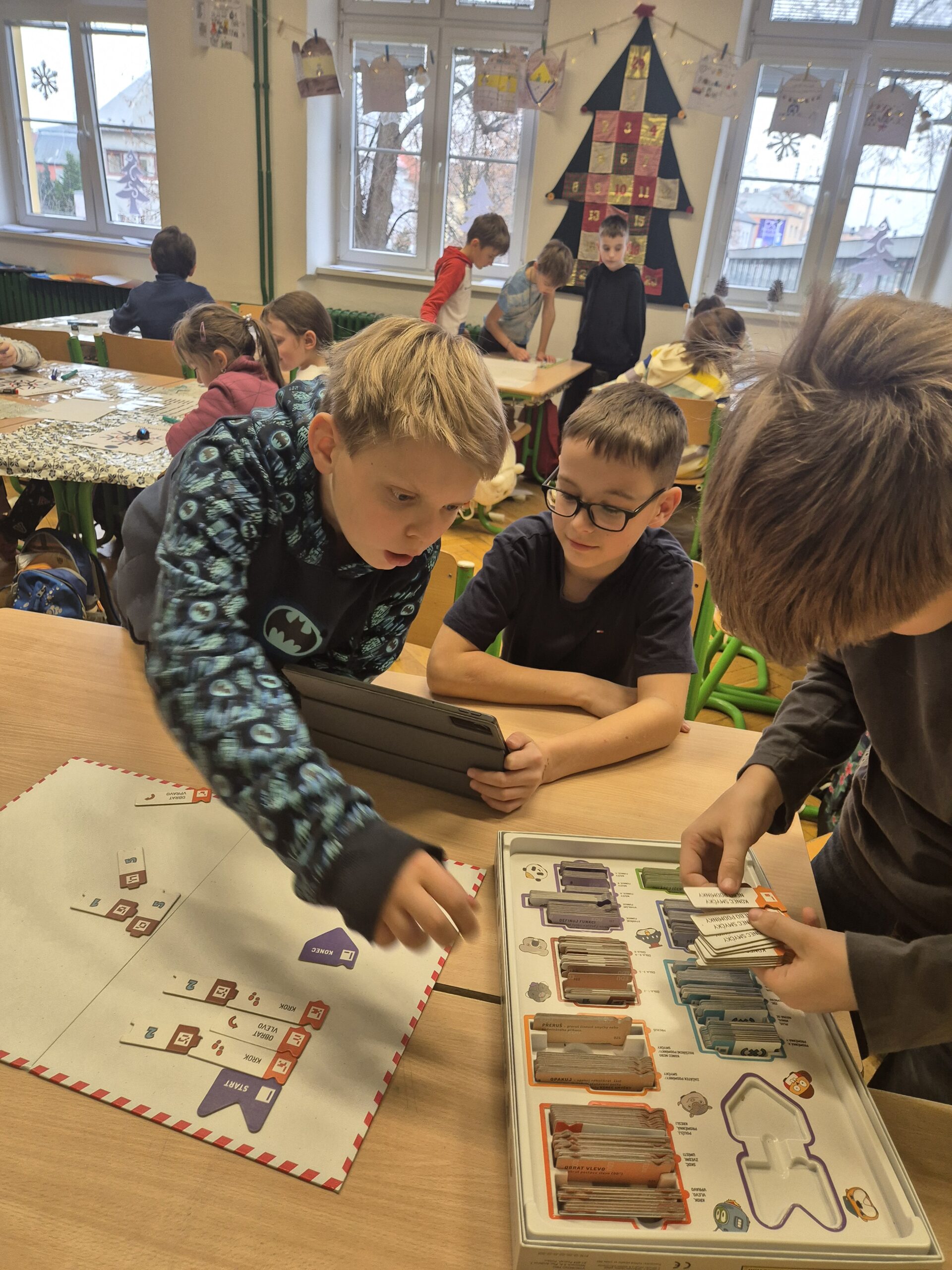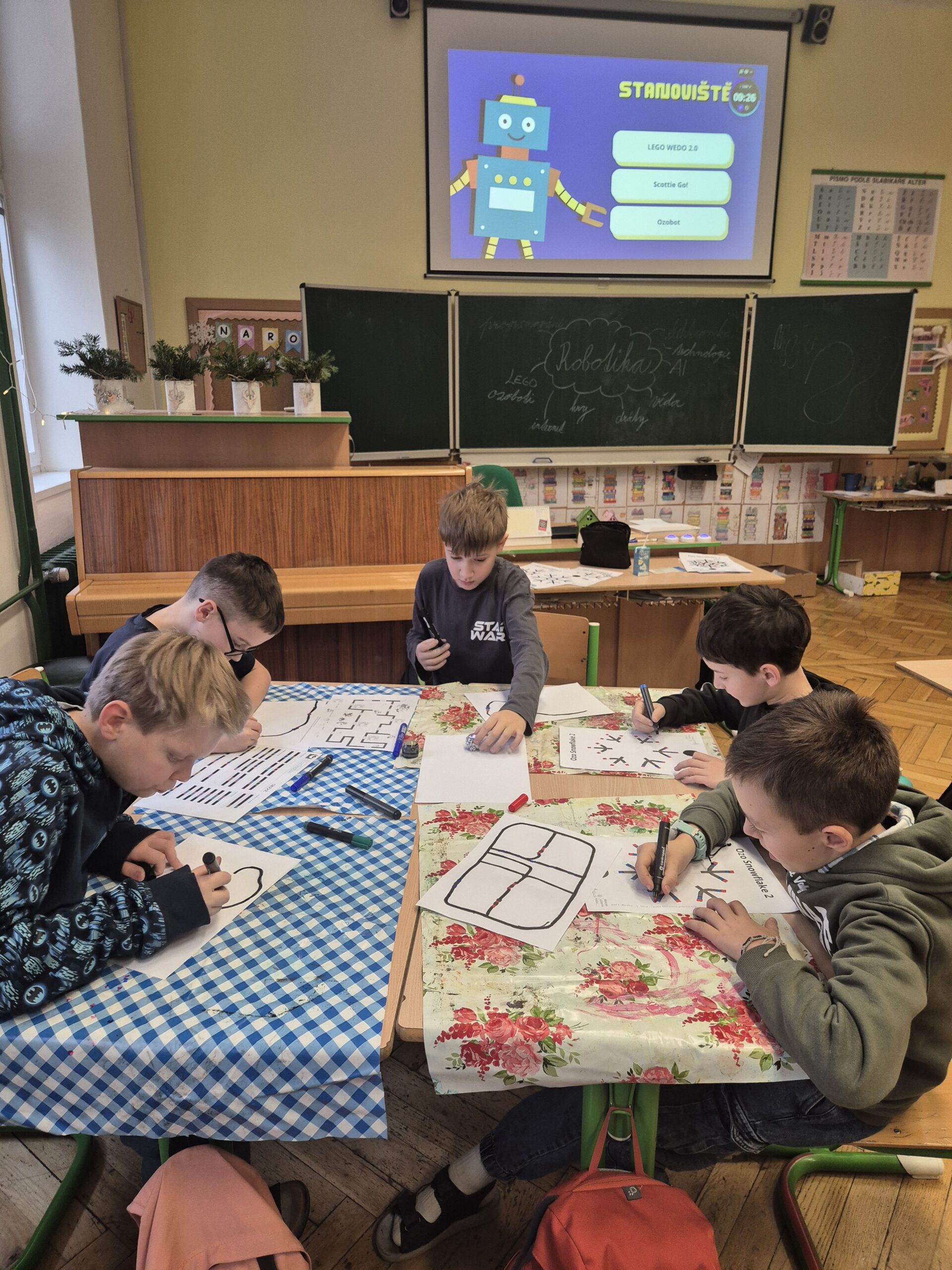 V další části vyučování se třída rozdělila do několika skupin, které se postupně střídaly. První skupina si zahrála deskovou hru Scottie Go!, která kombinuje práci s kartičkami, rozvoj jemné motoriky a skenování pomocí tabletu, jenž hru zobrazuje v digitálním prostředí. Další skupina stavěla auta ze stavebnice LEGO WeDo 2.0. Žáci postupovali podle návodu na tabletu, svá auta následně naprogramovali a rozjeli. Nechyběly ani malé závody. Poslední skupina se dále věnovala ozobotům – vytvářela ozovločky, doplňovala vánoční únikovku a sestavila ozokřečka, tedy ozobota jezdícího v nekonečném kolečku.