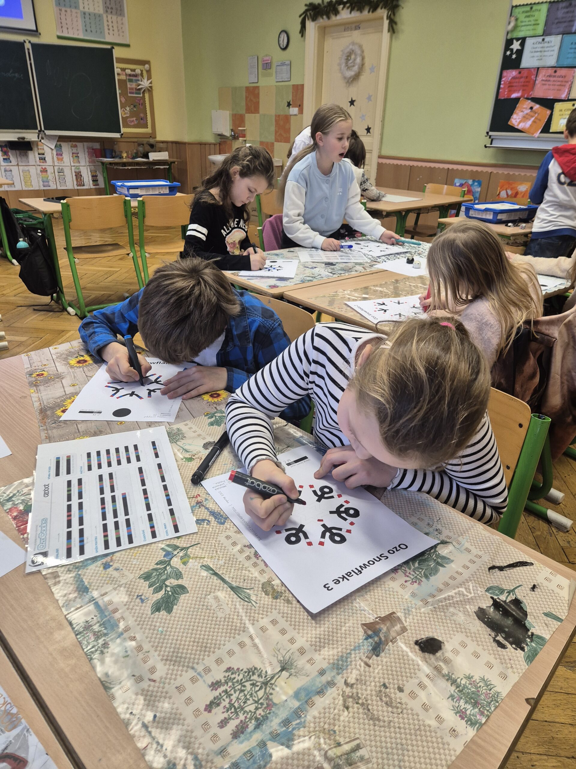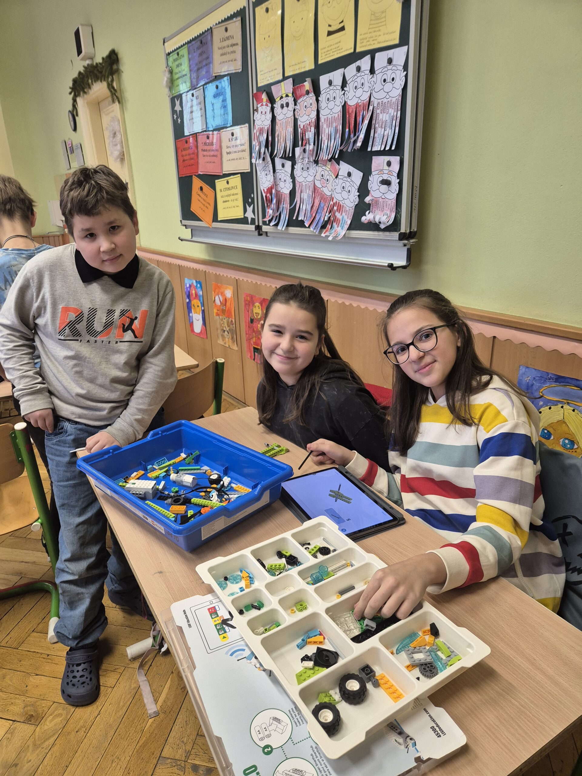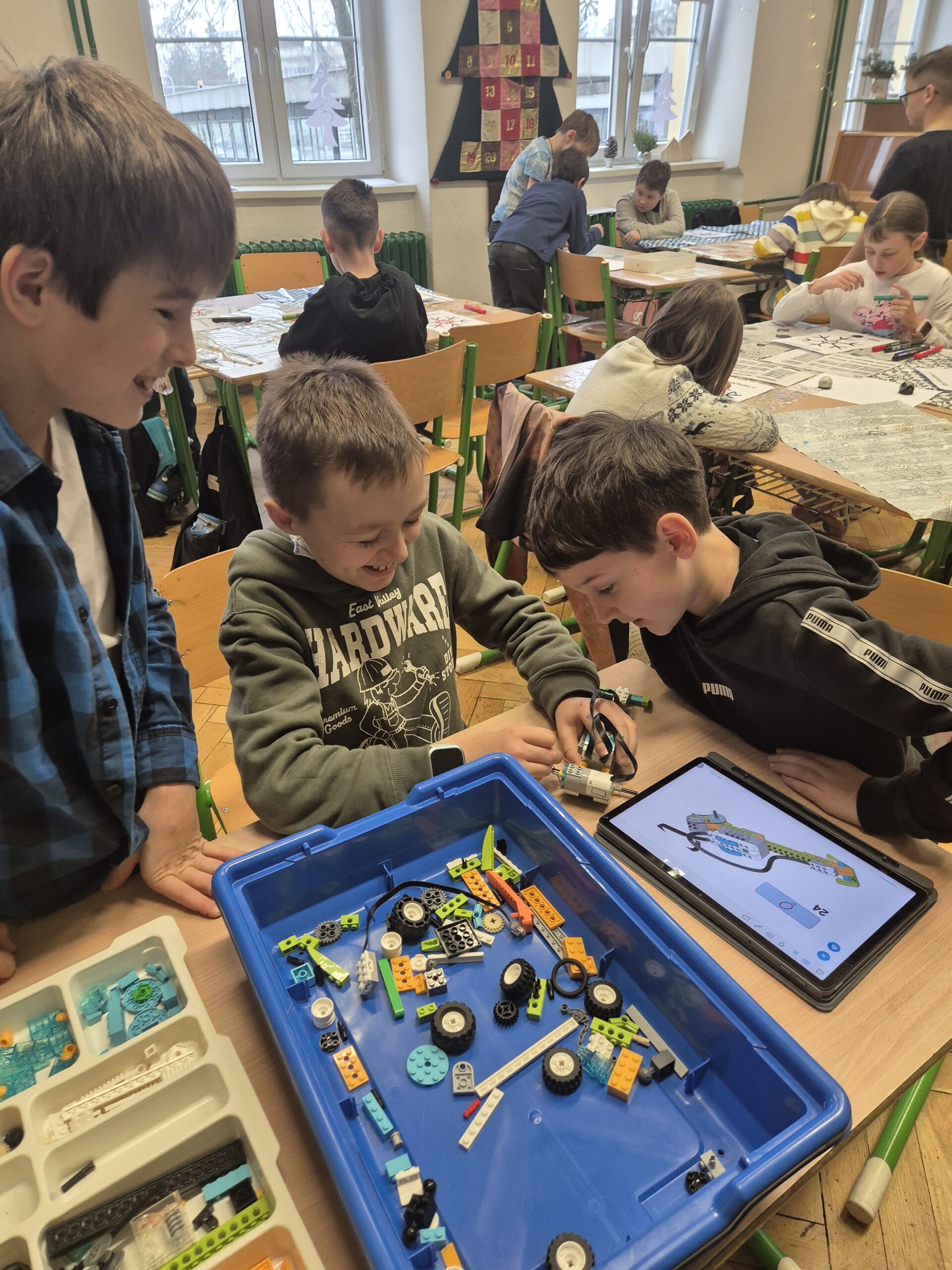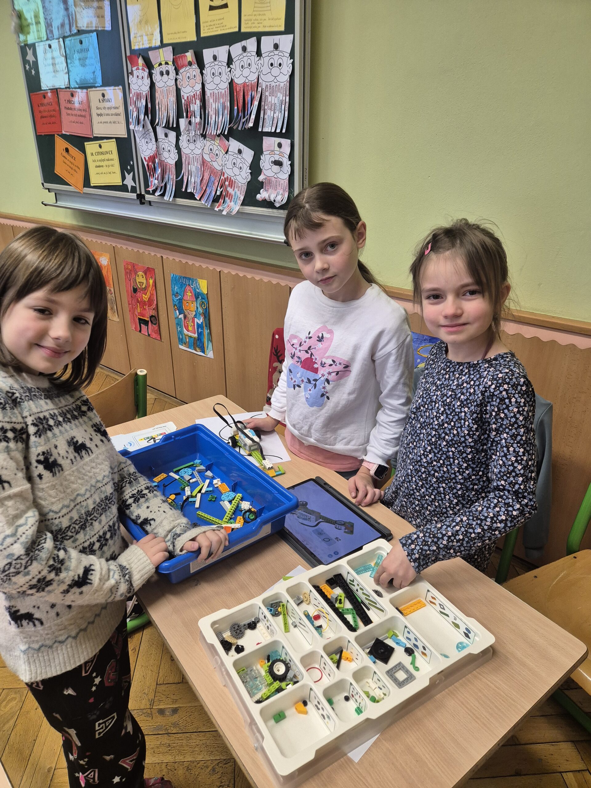 V další části vyučování se třída rozdělila do několika skupin, které se postupně střídaly. První skupina si zahrála deskovou hru Scottie Go!, která kombinuje práci s kartičkami, rozvoj jemné motoriky a skenování pomocí tabletu, jenž hru zobrazuje v digitálním prostředí. Další skupina stavěla auta ze stavebnice LEGO WeDo 2.0. Žáci postupovali podle návodu na tabletu, svá auta následně naprogramovali a rozjeli. Nechyběly ani malé závody. Poslední skupina se dále věnovala ozobotům – vytvářela ozovločky, doplňovala vánoční únikovku a sestavila ozokřečka, tedy ozobota jezdícího v nekonečném kolečku.