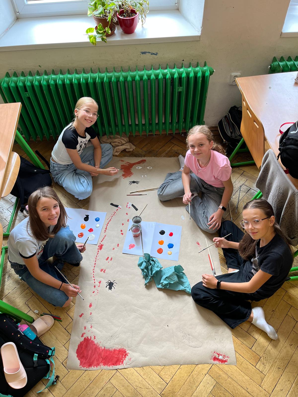 Naši žáci se chopili štětců a temper a pustili se do práce ve skupinkách přímo na zemi, kde měli dostatek prostoru pro své velkoformátové nápady. Každá skupina si mohla zvolit vlastní pojetí masky – ať už šlo o čarodějnici, ducha, kostlivce nebo zcela originální příšeru z jejich fantazie.