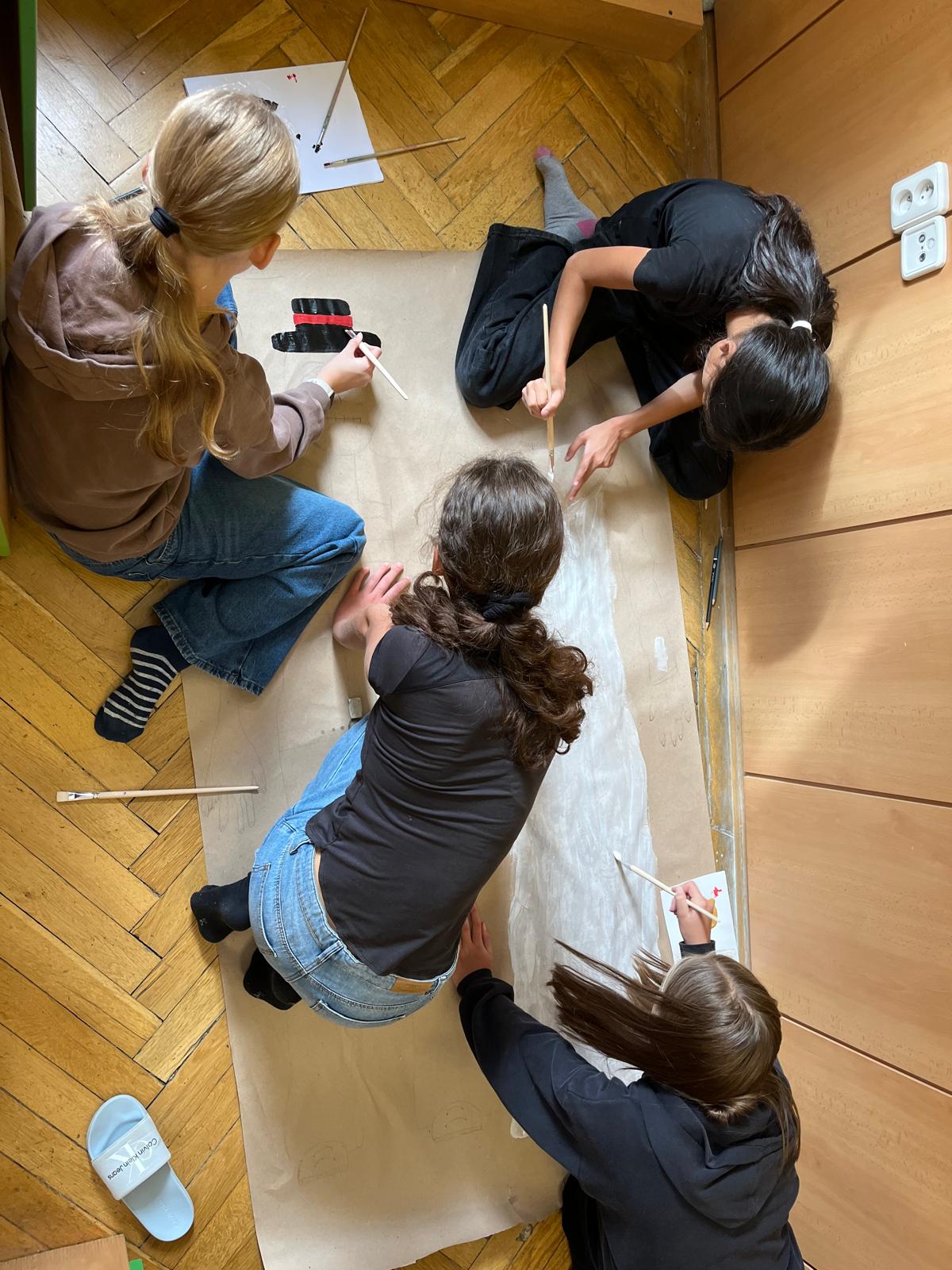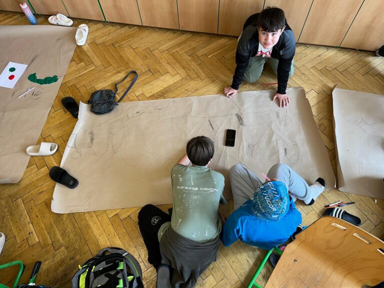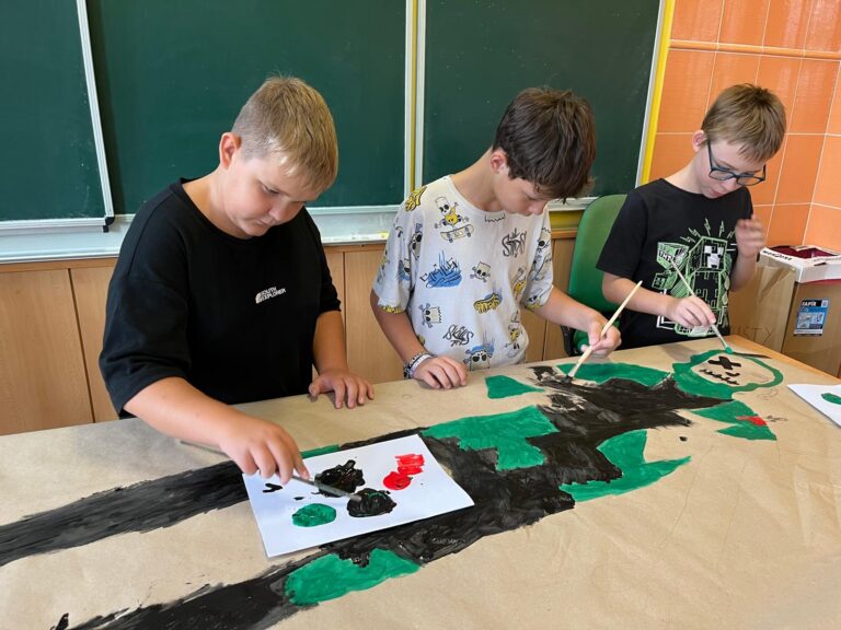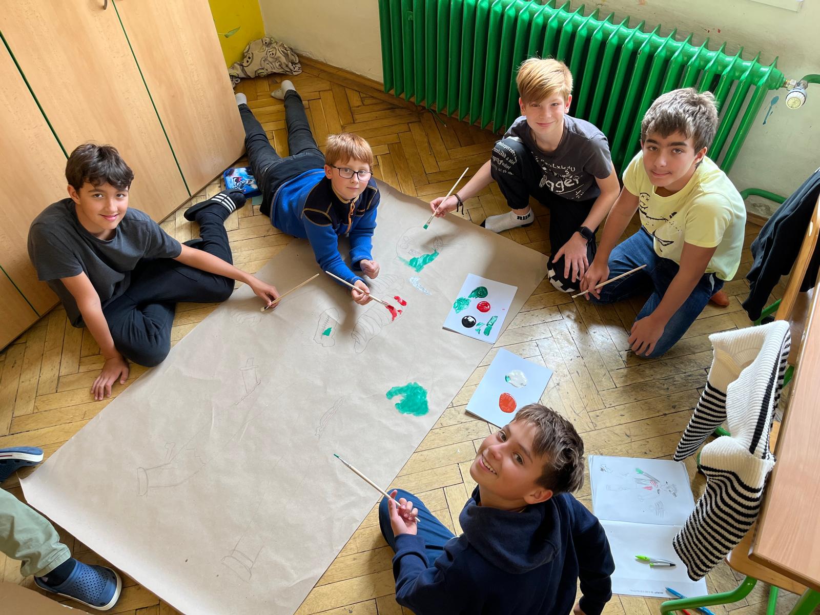 Naši žáci se chopili štětců a temper a pustili se do práce ve skupinkách přímo na zemi, kde měli dostatek prostoru pro své velkoformátové nápady. Každá skupina si mohla zvolit vlastní pojetí masky – ať už šlo o čarodějnici, ducha, kostlivce nebo zcela originální příšeru z jejich fantazie.