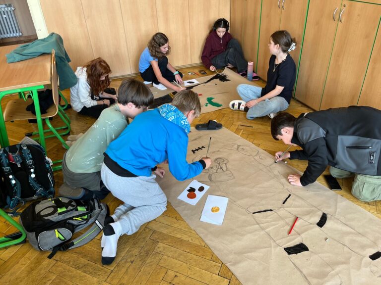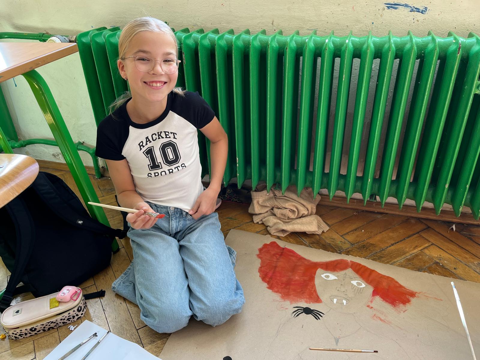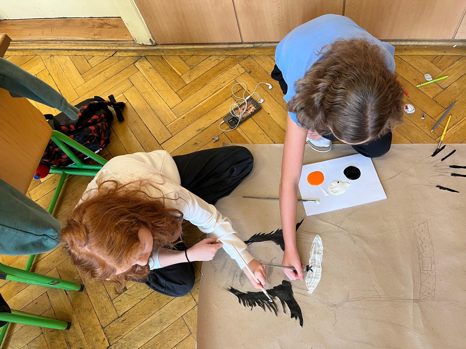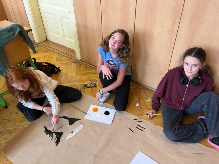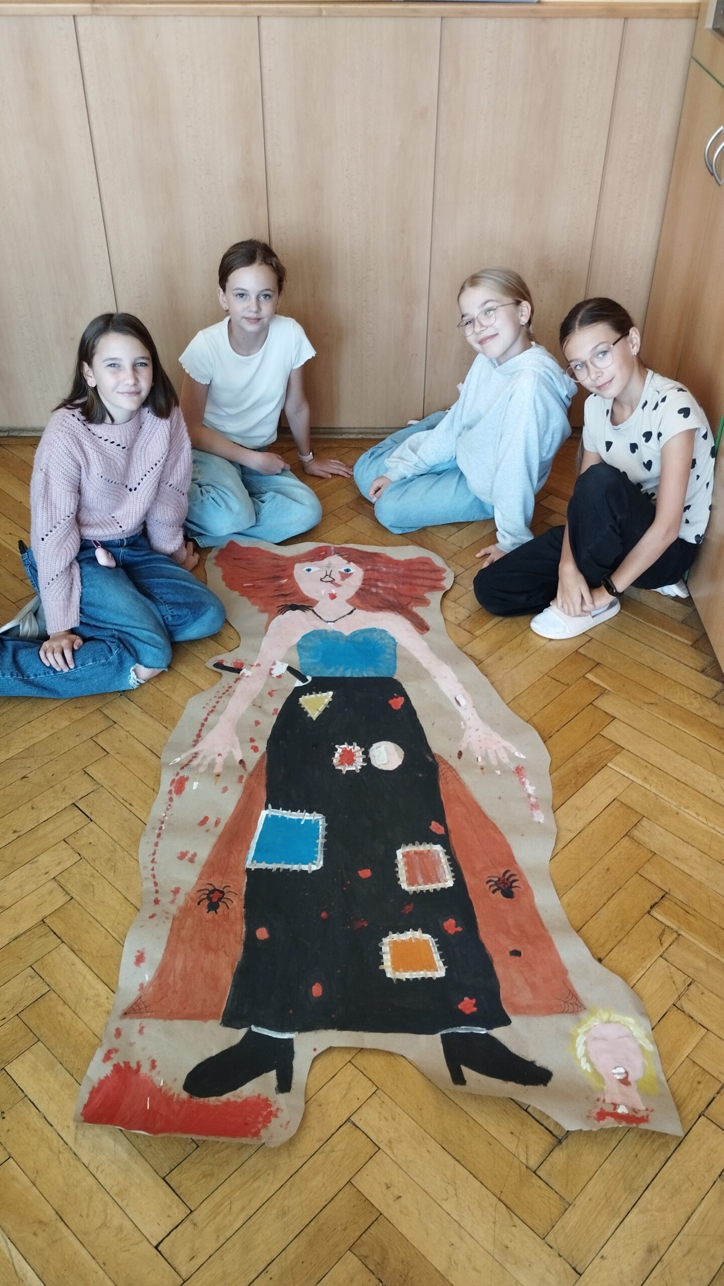 Naši žáci se chopili štětců a temper a pustili se do práce ve skupinkách přímo na zemi, kde měli dostatek prostoru pro své velkoformátové nápady. Každá skupina si mohla zvolit vlastní pojetí masky – ať už šlo o čarodějnici, ducha, kostlivce nebo zcela originální příšeru z jejich fantazie.