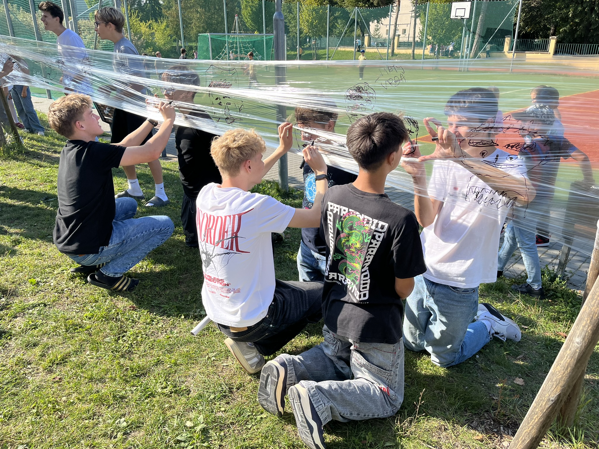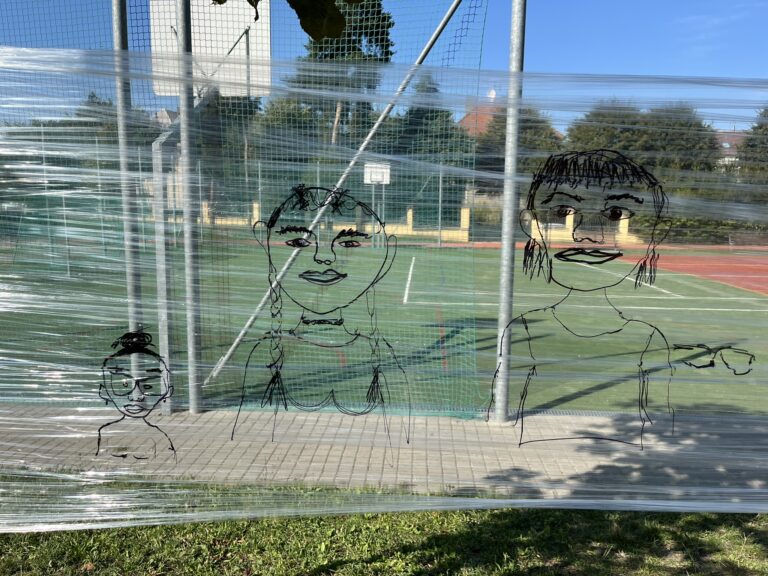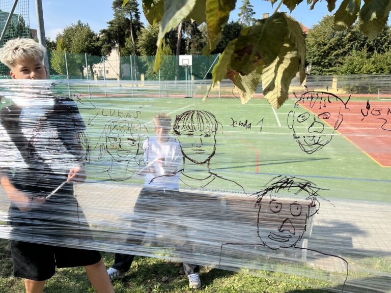 V hodinách výtvarné výchovy jsme využili krásného počasí a vydali se tvořit ven. Mezi stromy jsme natáhli potravinovou fólii, která se proměnila v netradiční „plátno“ pro naše kresby.