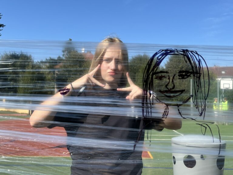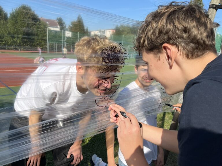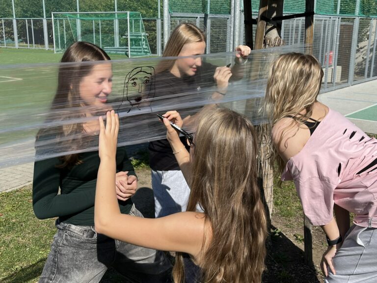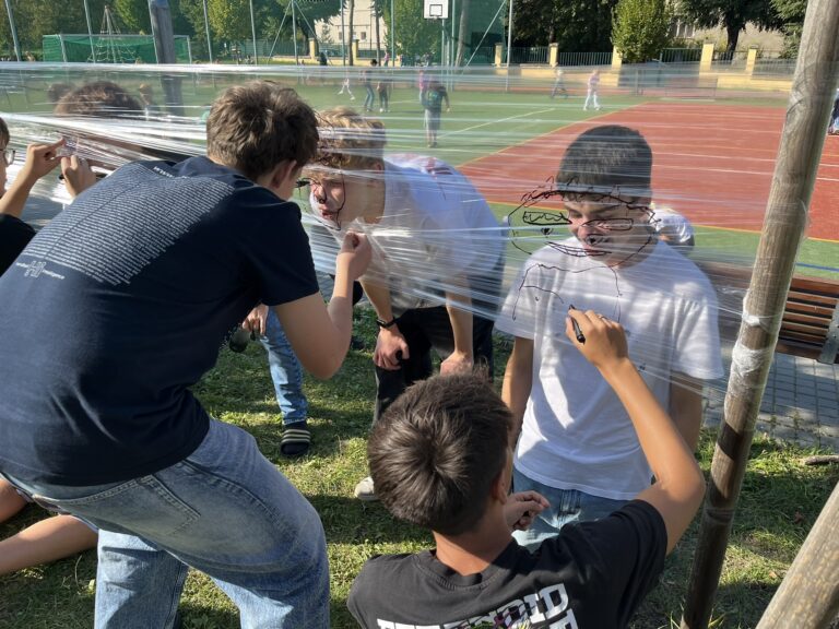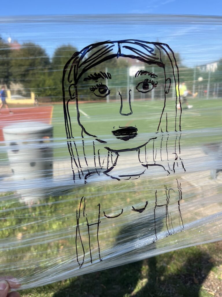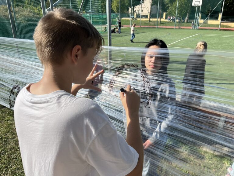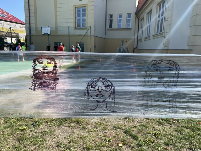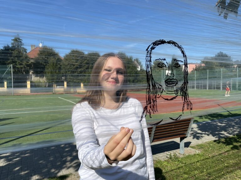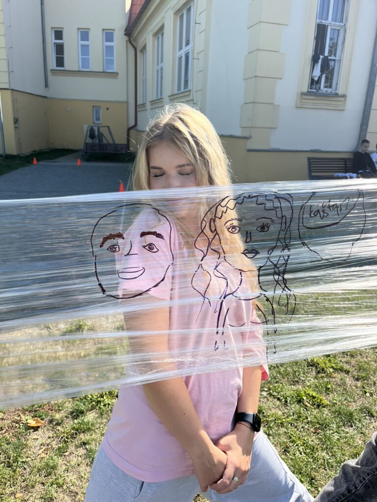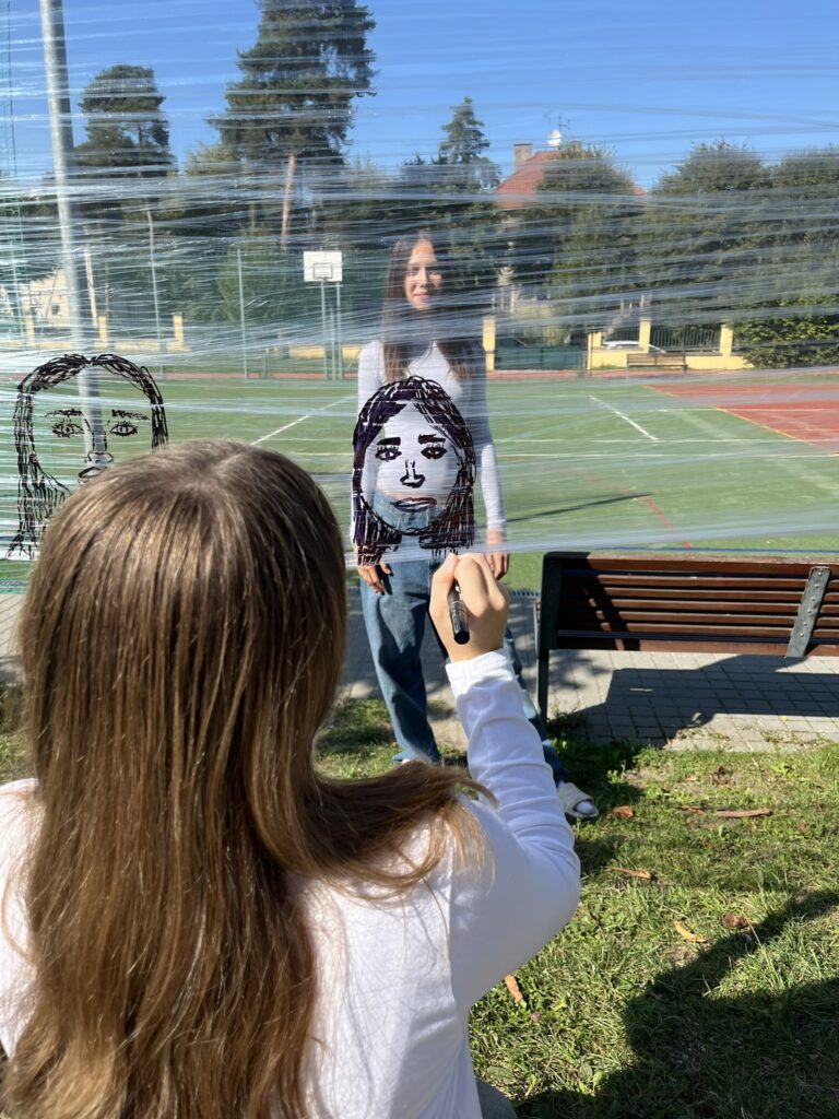 Žáci devátých tříd pracovali ve dvojicích – jeden si stoupl za fólii a druhý ho přímo na ni portrétoval. Vznikly tak originální portréty, jejichž tvorba byla nejen zábavná, ale také náročná na soustředění a pozornost.