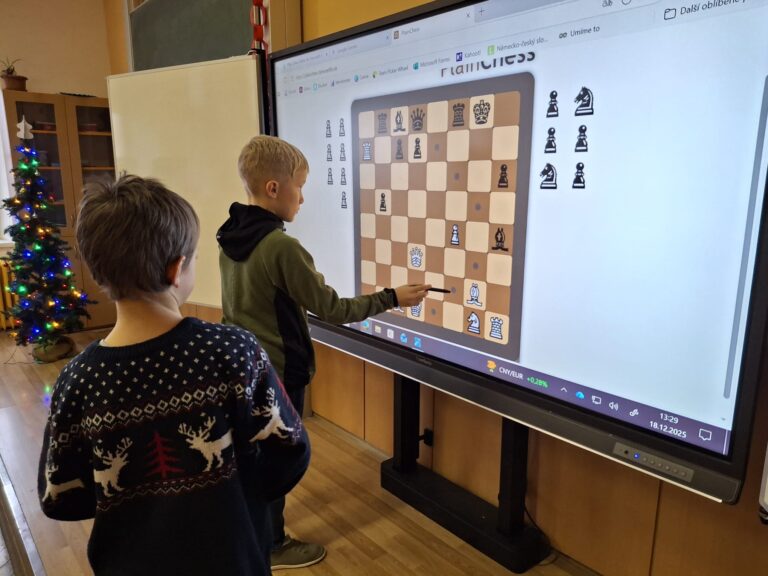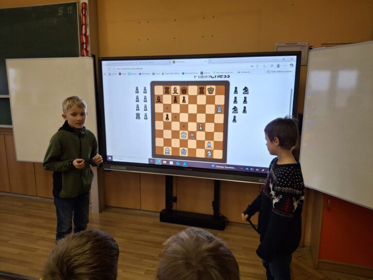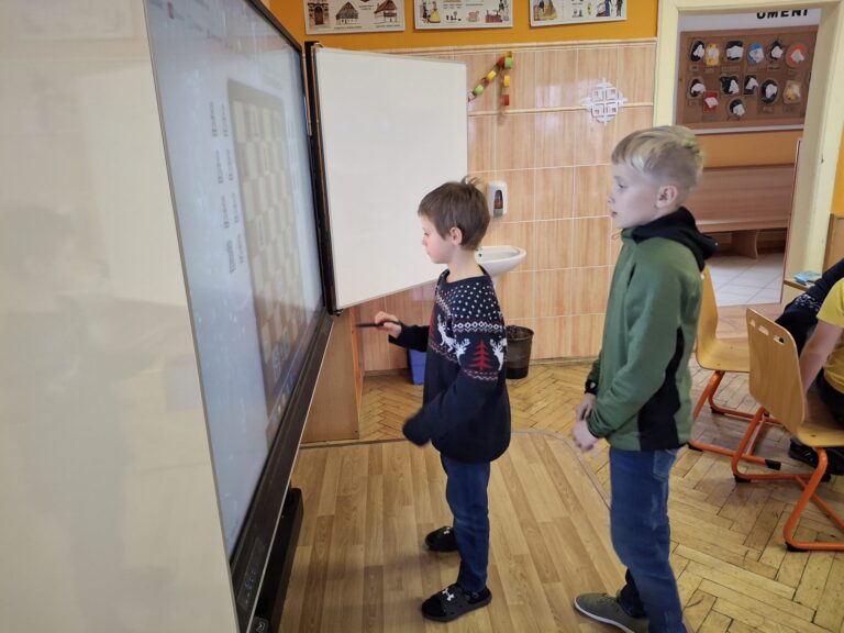 Zajímavostí byla i zapojená technika. Když už klasické šachovnice nestačily, využili jsme interaktivní tabuli jako další herní plochu, což akci dodalo moderní rozměr.