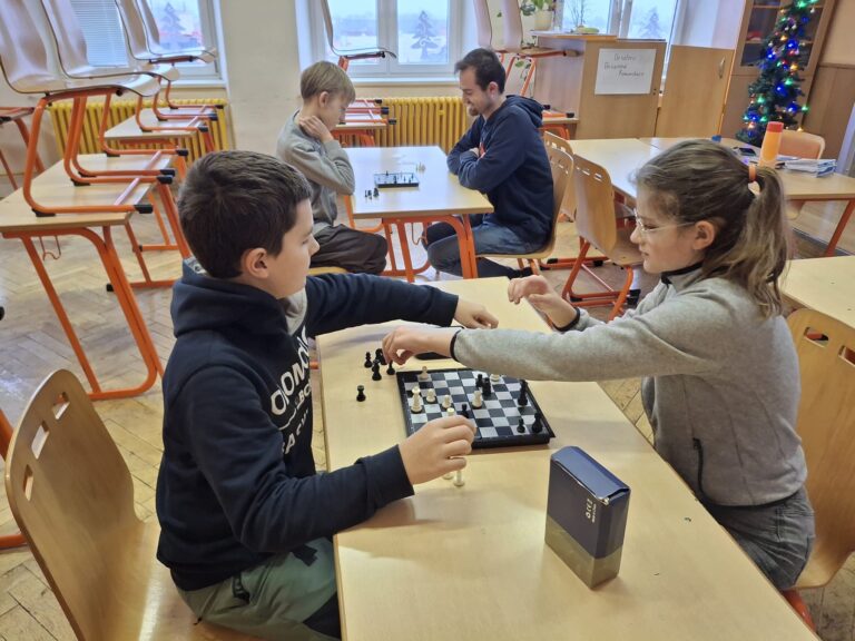 Ve čtvrtek 18. prosince, hned po skončení Vánočních dílen, se v naší škole rozhostilo soustředěné ticho doprovázené klapotem figurek. Konal se šachový turnaj, který pro své spolužáky zorganizoval Vojtěch ze 7.A. Vojta se postaral o vše potřebné – od přihlašovacích formulářů přes diplomy až po zajištění šachovnic.